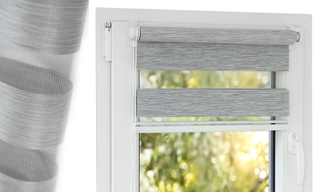 Tkanina Dzień-Noc Premium pozwala regulować ilość wpuszczanego światła dzięki dwóm równoległym warstwą materiału i naprzemiennym pasom (zaciemniającym i prześwitującym).