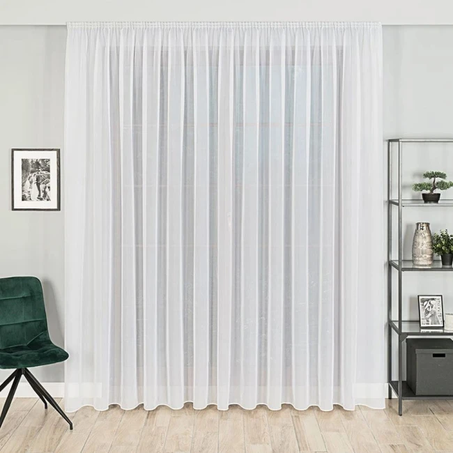 - Firany uszyte z woalu — tkaniny stworzonej z najwyższej jakości przędzy poliestrowej.