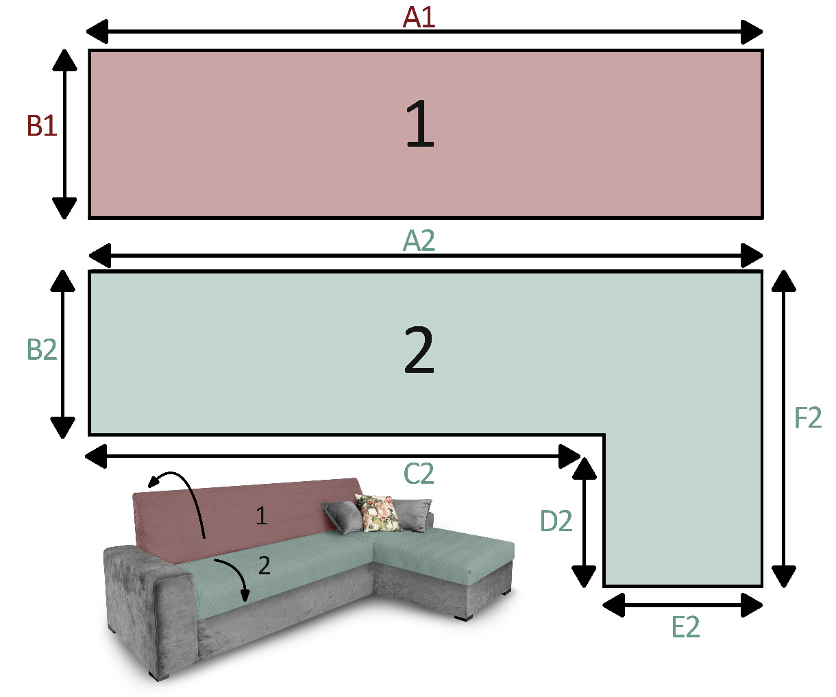 W przypadku narzuty do siedziska kanapy z narożnikiem L należy zmierzyć wszystkie wymiary siedziska jak na poniższym rysunku i podać je w odpowiednich polach na sklepie.