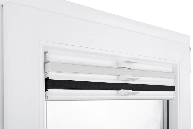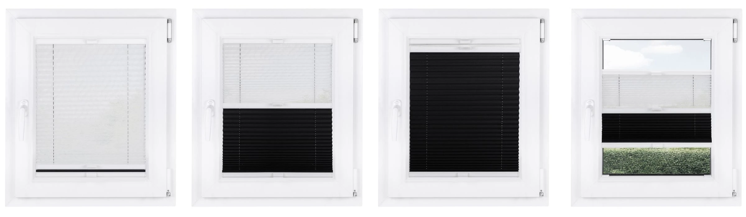 Dzięki zastosowaniu dwóch typów materiału w jednej plisie, możliwe jest wiele sposobów zasłonięcia okna: